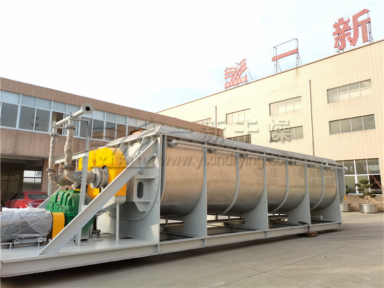 ??干燥機(jī)以蒸汽、熱水或?qū)嵊妥鳛榧訜峤橘|(zhì),軸端裝有熱介質(zhì)導(dǎo)入導(dǎo)出的旋轉(zhuǎn)接頭。加熱介質(zhì)分為兩路,分別進(jìn)入干燥機(jī)殼體夾套和槳葉軸內(nèi)腔,將器身和槳葉軸同時(shí)加熱,以傳導(dǎo)加熱的方式對物料進(jìn)行加熱干燥。被干燥的物料由螺旋送料機(jī)定量地連續(xù)送入干燥機(jī)加料口,物料進(jìn)入槳葉后,通過槳葉的轉(zhuǎn)動使物料翻轉(zhuǎn)、攪拌,不斷改變加熱界面,與器身和槳葉接觸,被充分加熱,使物料所含的表面水分蒸發(fā)。同時(shí),物料隨槳葉軸的旋轉(zhuǎn)成螺旋軌跡向出料口方向輸送,在輸送中繼續(xù)攪拌,使物料中滲出的水分繼續(xù)蒸發(fā)。zui后,干燥均勻的合格產(chǎn)品由出料口排出。